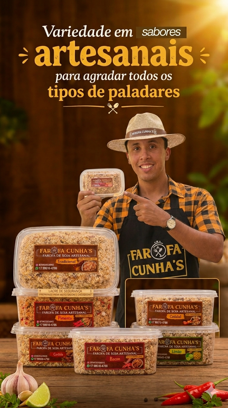Nossas farofas nasceram de uma receita familiar, sempre presente em todos os momentos especiais da família Cunha — onde nunca podia faltar a tradicional farofa de soja artesanal à mesa. Produzidas em Novo Horizonte/SP, são feitas com ingredientes selecionados, cuidado em cada detalhe e aquele toque artesanal que faz toda diferença: mais sabor, mais qualidade e o carinho que só uma comida feita de verdade consegue transmitir.